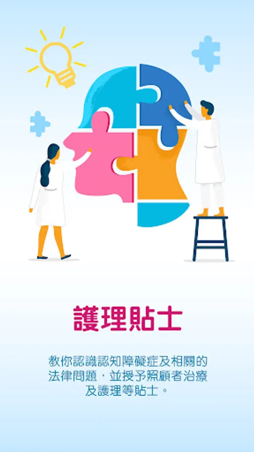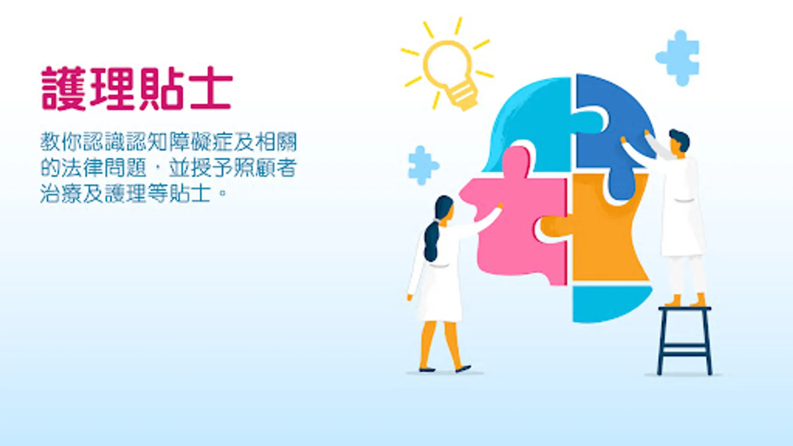 護理貼士:「認識認知障礙症」、「治療及護理之旅」、「給照顧者的貼士」及「相關法律資訊」文章,所有資訊由醫生及專業人士提供。