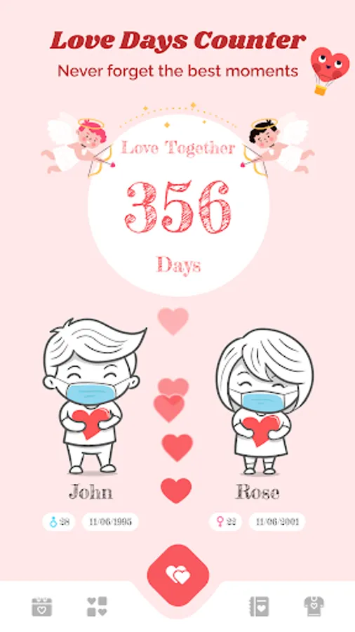 - Choose a date to start falling in love to let the app calculate the number of days together