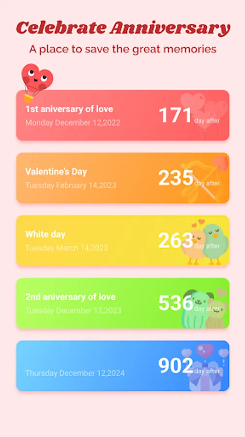 “Love days - Couple widget” features anniversary notifications, which will always notify you when your anniversary is approaching, so you never forget your special day.