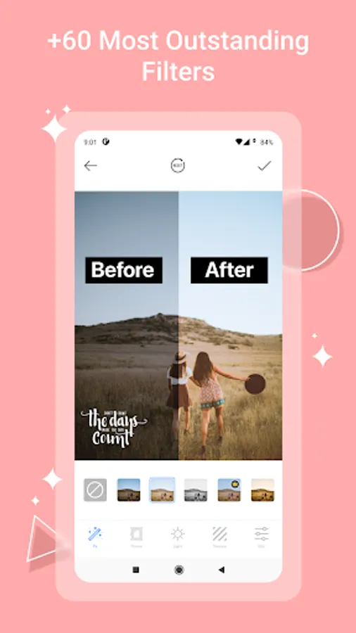 - Filter: 50+ photo filters with 100+ effects. Turn your pics into art with perfect filters, effects and photo editing tools