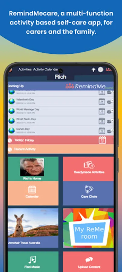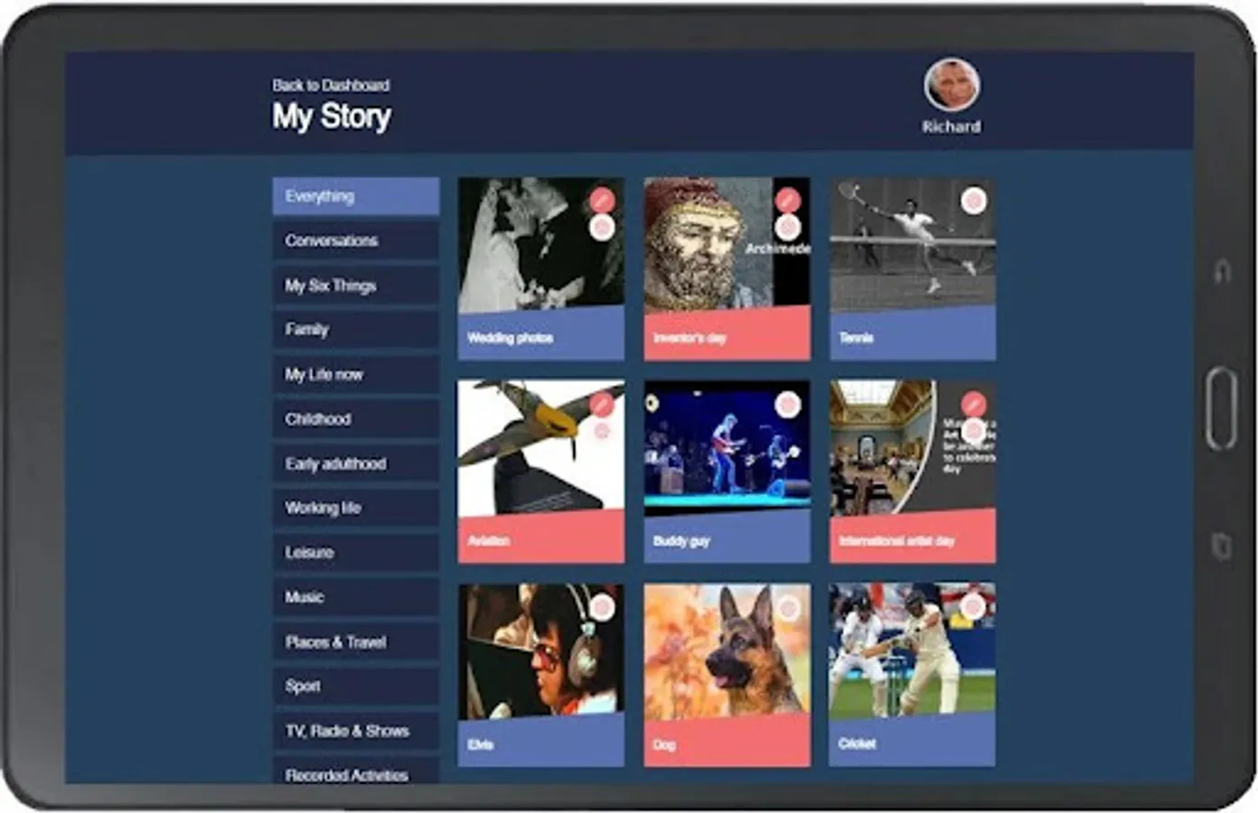 ReMe provides family, friends and carers with rewarding bespoke activities that entertain whilst building a vault of personal information. Together you explore pictures, music and video collecting favourites along the way. Fun to use, it’s a safe place to store and share information that really matters to the person cared for.
