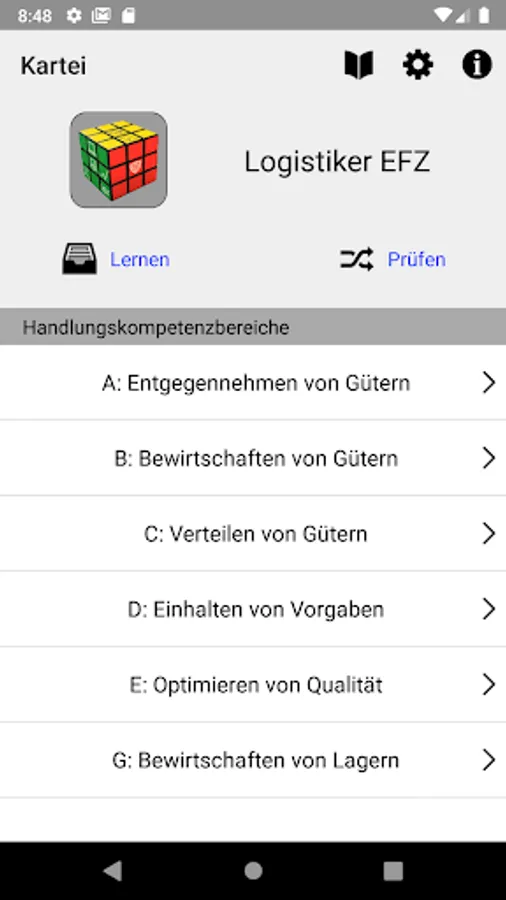 This app contains over 1000 index cards with exam relevant questions to the areas of competence: