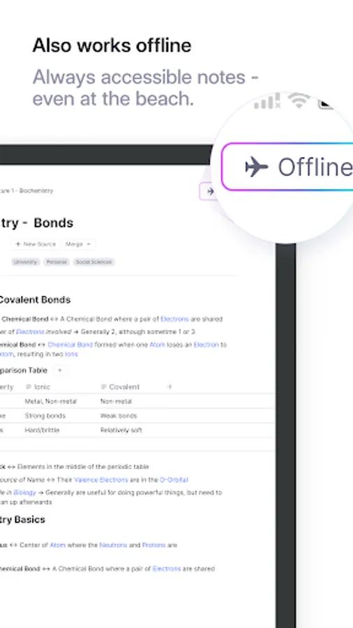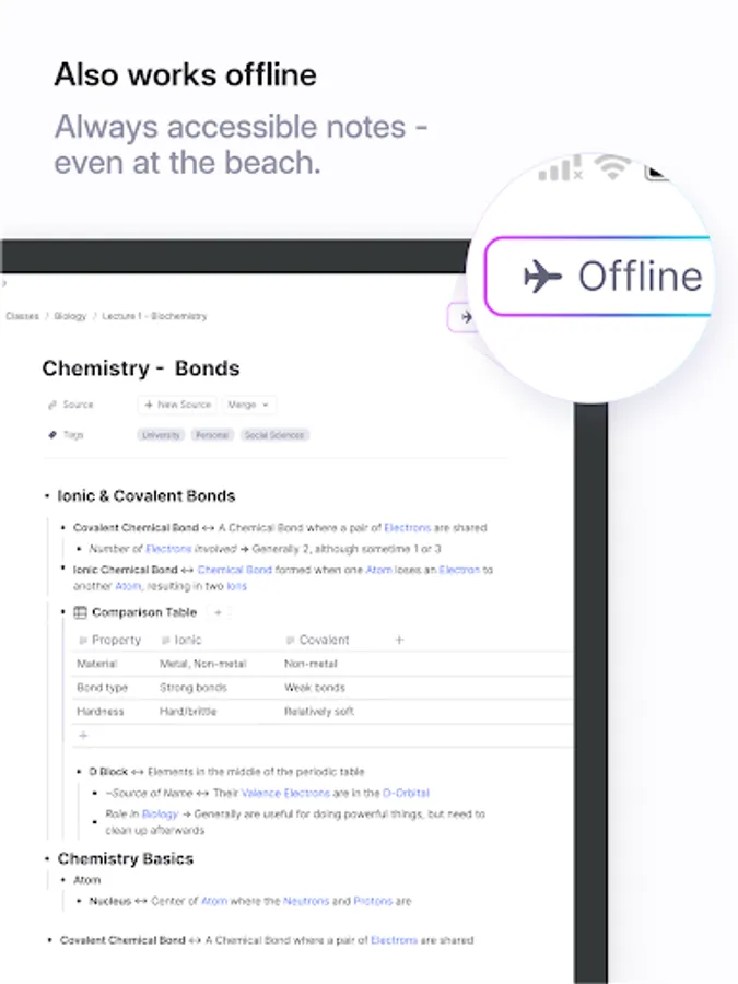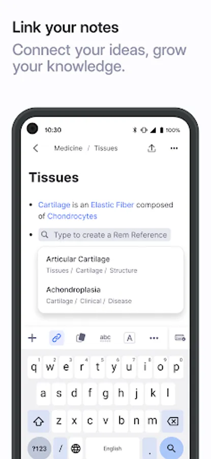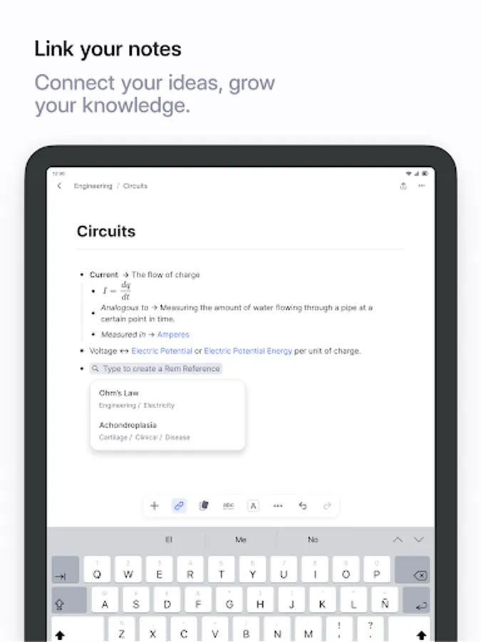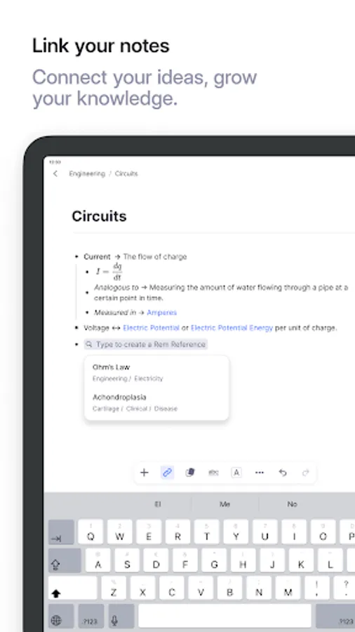 Linked Reference: Reference and review all notes connected to a specific topic with contextual links and create flashcard sets on-the-fly as you take notes.