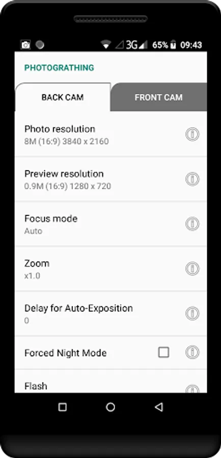- adjust camera parameters according to your needs: resolution, zoom, night-mode, flash