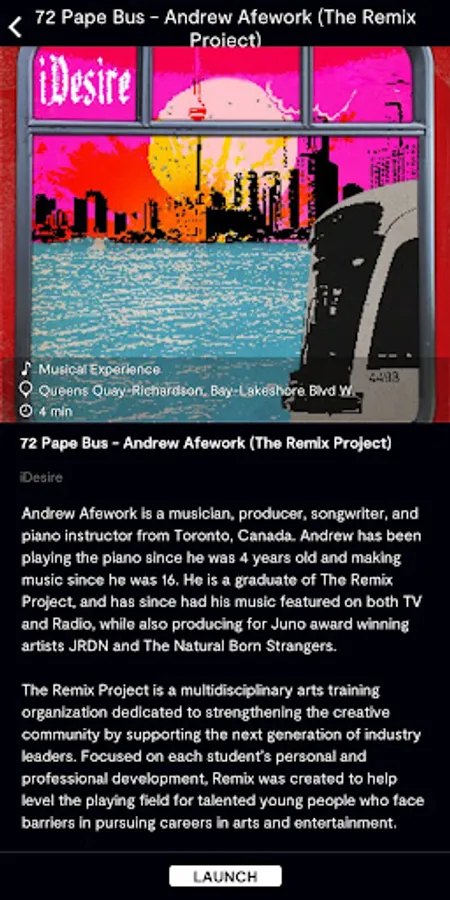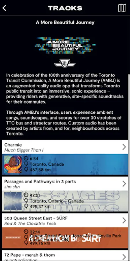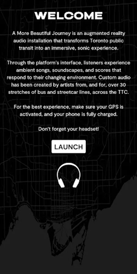A More Beautiful Journey (AMBJ) is a landmark AR (augmented reality) audio installation transforming hundreds of kilometers of Toronto public transit. With over 30 songs, soundscapes and scores from artists across the Greater Toronto Area, AMBJ provides TTC riders with generative, site-specific soundtracks for their commutes.