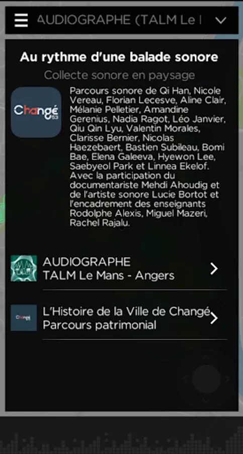 During the month of November 2018, in partnership with the city of Changé, students from the TALM Tours-Angers-Le Mans School of Art and Design, accompanied by their teachers Rodolphe Alexis, Miguel Mazeri and Rachel Rajalu and the documentary maker Medhi Ahoudig led a workshop project "sound collection in landscapes". The goal was to collect sound atmospheres, testimonies, sound effects, texts and other sounds of the city of Changé around the route of the urban walk. A second transfer took place in March 2019 accompanied by the artist Lucie Bortot to finalize the project and create a soundtrack.