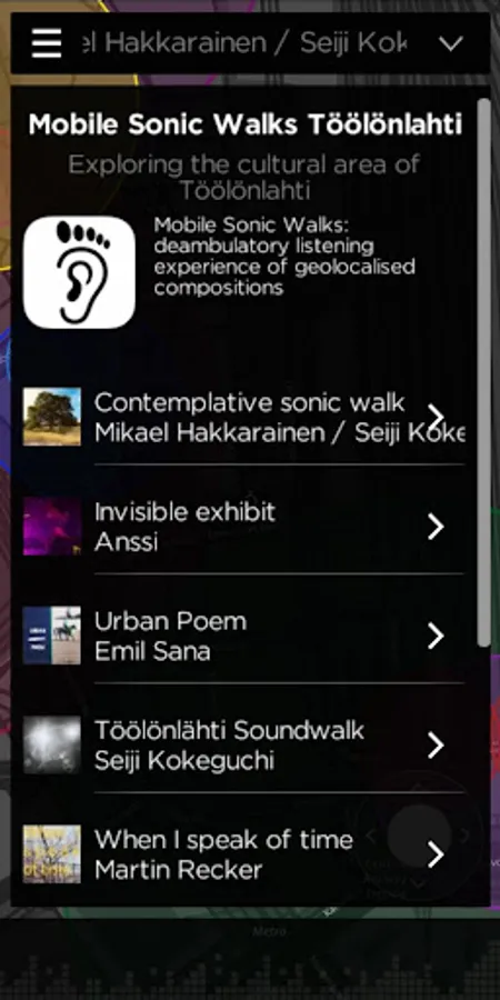 Mobile Sonic Walks proposes a deambulatory listening experience of musical compositions created for and diffused in a chosen site through geolocalisation by the students of the Centre for Music and Technology of the Sibelius Academy at the Uniarts Helsinki. Wandering around in the area you explore the sonic walks with your headphones and mobile phone.