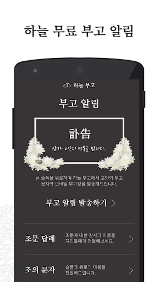 하늘 부고 알림으로 정성스럽게 부고를 알려보세요.