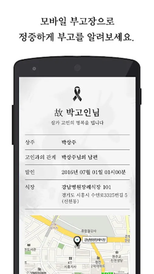 - 모바일 부고장을 통해 장례 장소, 시간을 자세히 전할 수 있습니다.