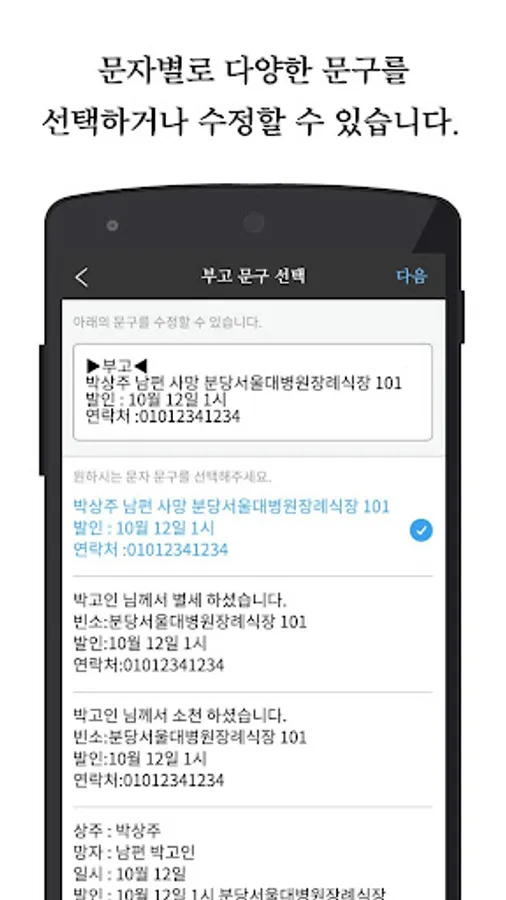 갑자기 상으로 경황이 없을때 지인들에게 신속하고 정중하게 모바일 부고장을 보내는 서비스입니다.