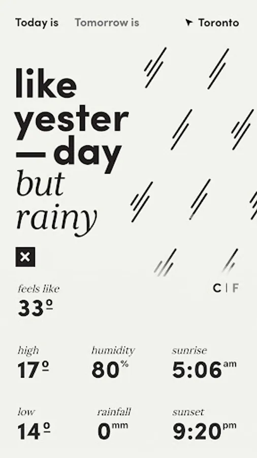 LikeYesterday compares today's weather to weather you're already familiar with: yesterday's. So when you step outside, you relatively know what to expect.