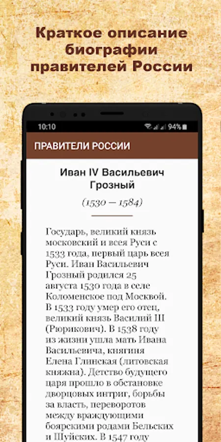 The historical dictionary of basic concepts and terms is also given. The application will be useful for students to prepare for the exam in history and will help to remember the school course effortlessly. Also, it will not leave indifferent students, teachers and ordinary history buffs.