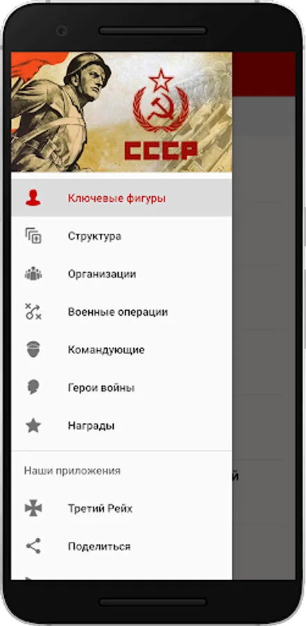 A reference book containing a description of the structure, organization of troops, weapons, key figures, military operations, commanders-in-chief of troops, war heroes and awards with photographs of the Soviet Union in World War II.