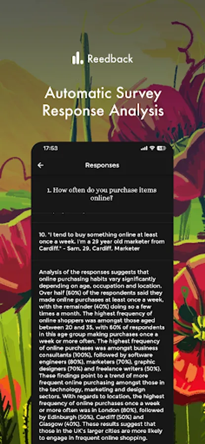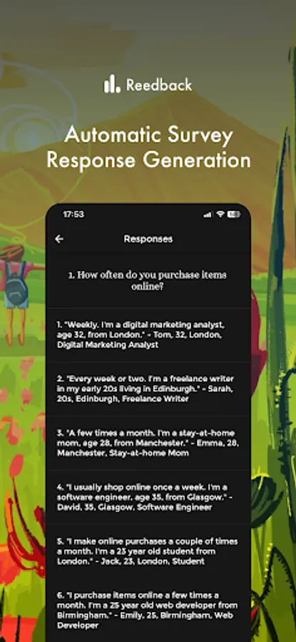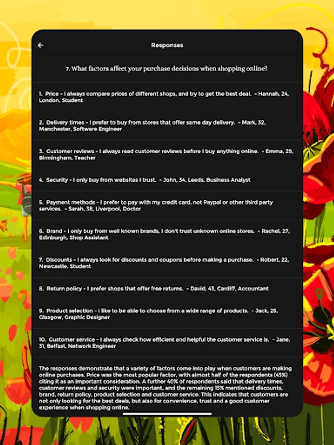 Automated user response analysis: For each question on the survey, a summary analysis of all the simulated user feedback will be provided.