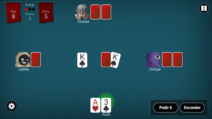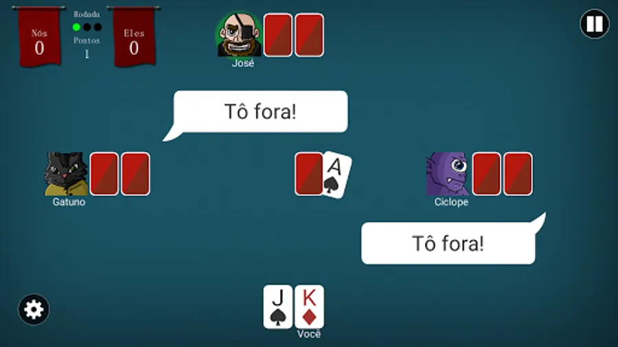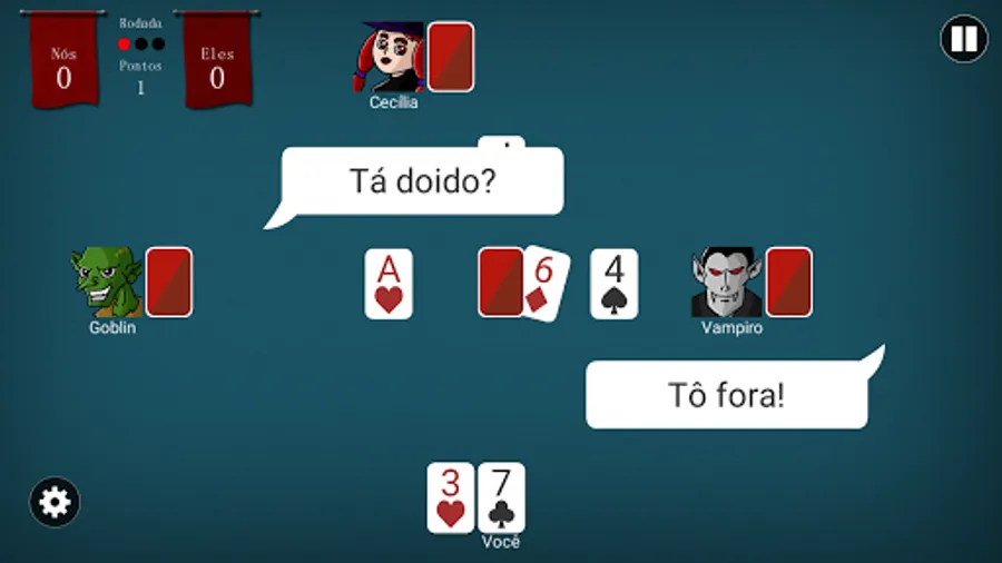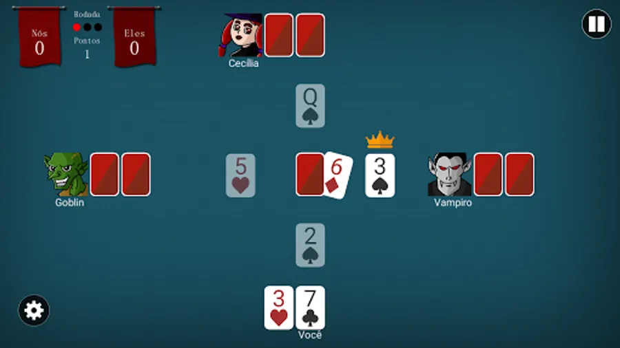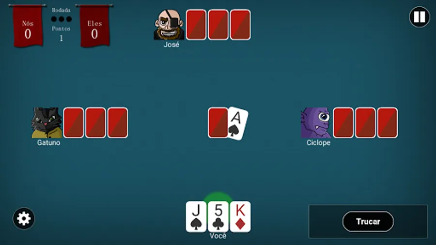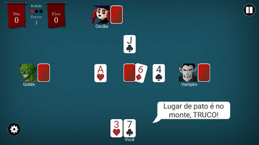 Play Campaign mode with 41 levels and defeat various enemies and bosses by playing Truco Paulista in matches 2 VS 2. You have the freedom to choose your partner with intelligence that you like best.