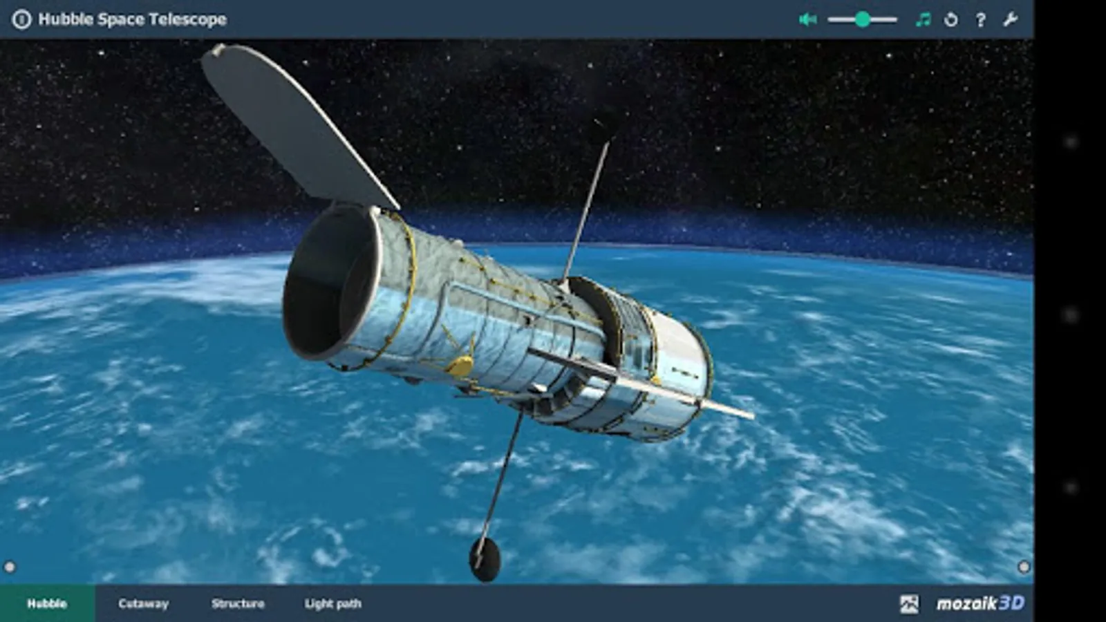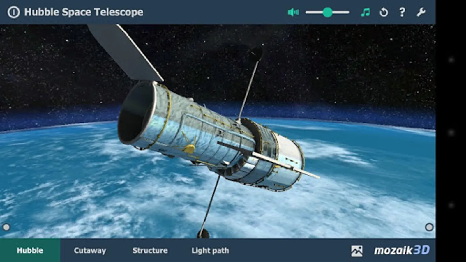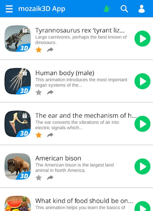 On the application's main page, you can filter 3Ds by topic or use the search field to find a particular 3D scene. You can open the scenes by tapping the play button. In the sidebar menu, you can change the language, buy a mozaWeb PREMIUM subscription, send feedback and rate the app.