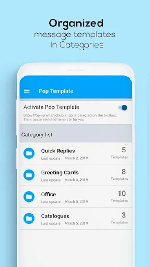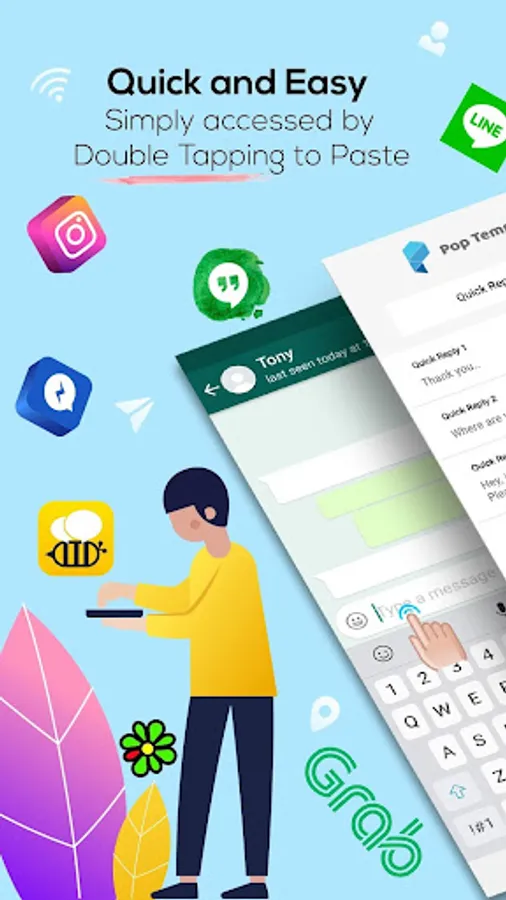 Pop Template gives easy and quick access to paste easily by double-tapping on the message bar and choose a Pop response to send to the recipient. No need to type anything as everything will be pasted in the message bar and you can send it with just a tap!
