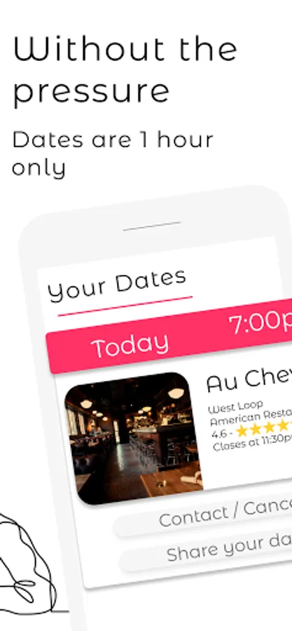 Get to know someone but don't feel overly committed. Dates are organized for today, tomorrow or the day after & they're only 1 hour long.