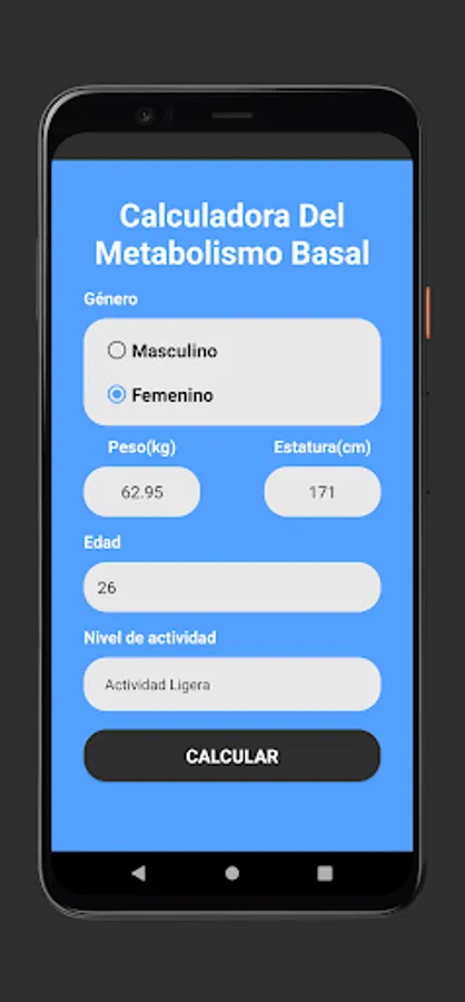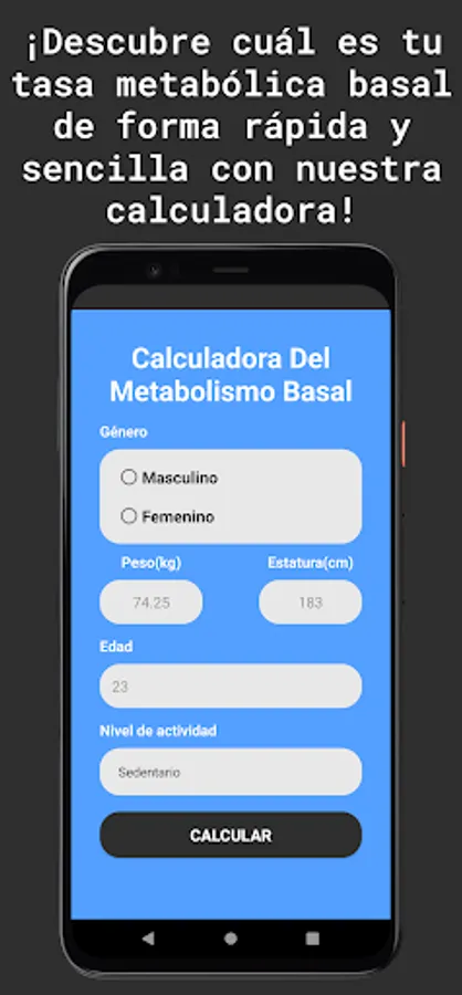 By providing your gender, weight, height, and age, our app will calculate your Basal Metabolic Rate (BMR) and tell you how many calories you'll need to keep your body nourished for 24 hours.