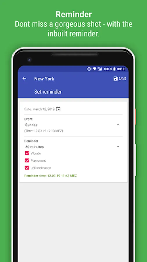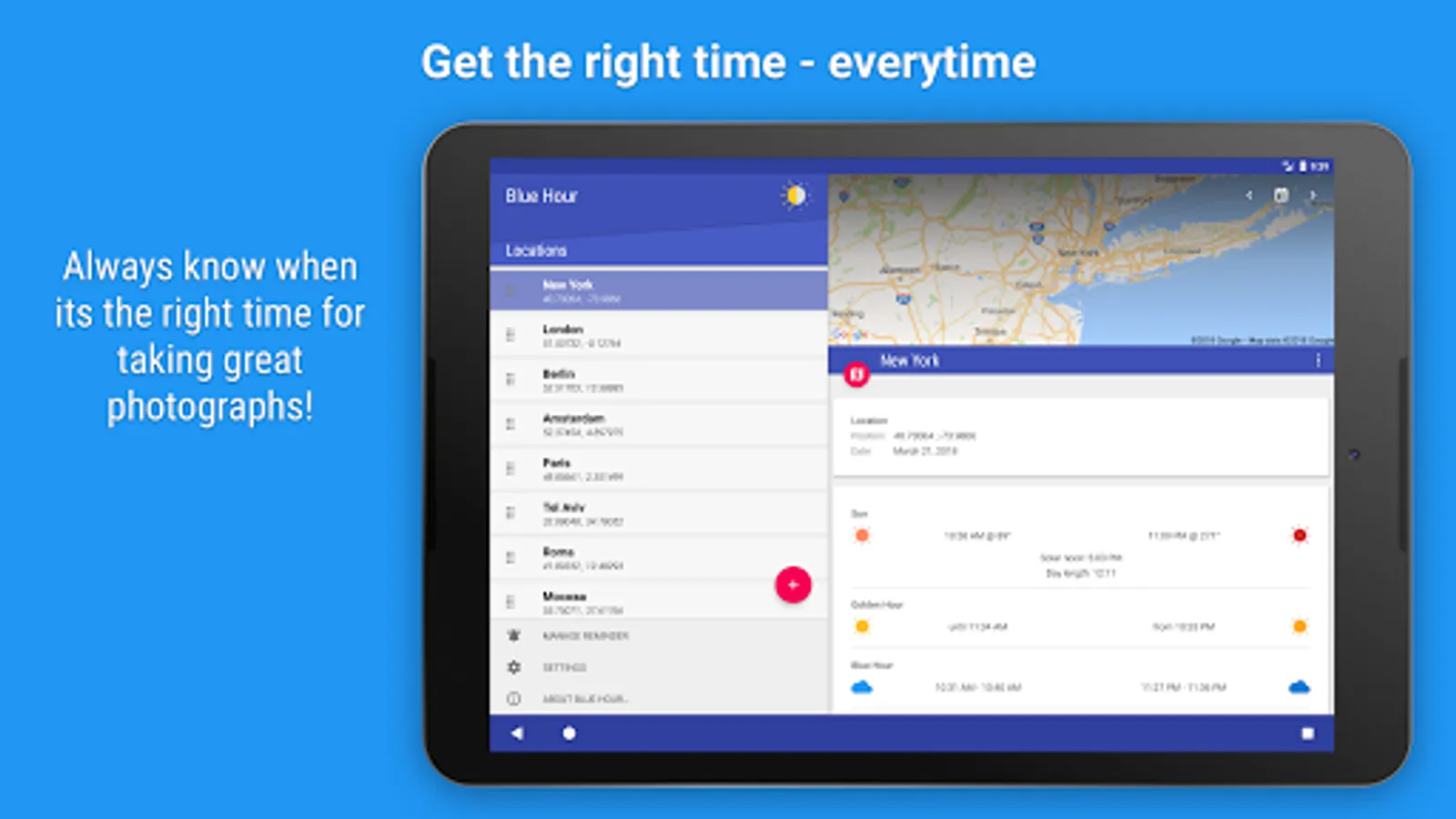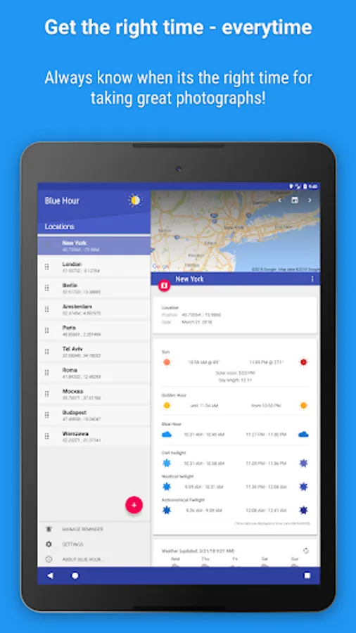The Blue Hour describes a period of dawn and dusk, when the sky is colored specially which is very interesting for photography. The duration and timing of the Blue Hour varies depending on location and on the date. In order to achieve optimum results and to plan in advance the app Blue Hour (solar calculator) has been developed.