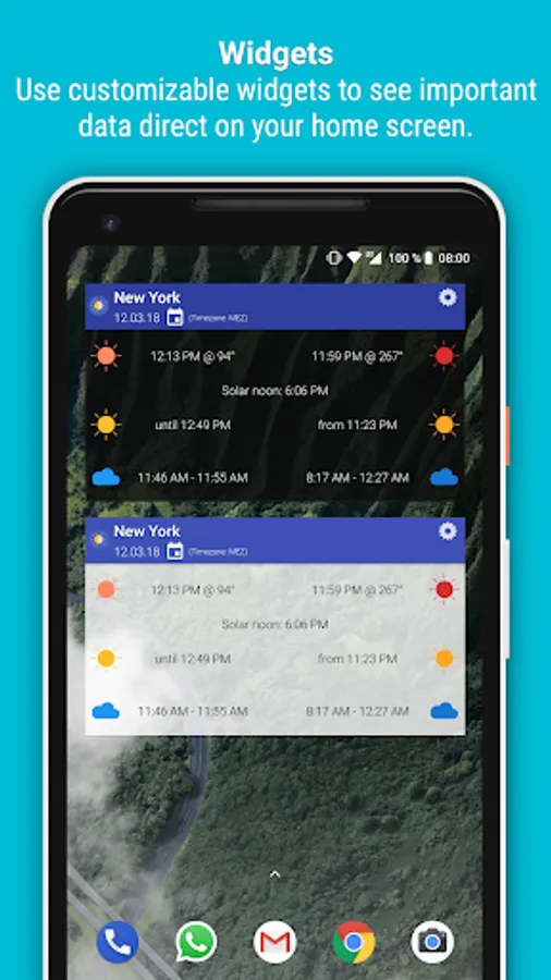 In this app you can view data for multiple locations. These can be defined manually or automatically by getting your GPS location. Additionally you have the opportunity to manually set timezones of the locations, which can be helpful if you are planning trips to locations with another timezone than the one, where you currently are in.
