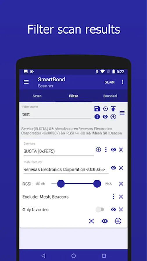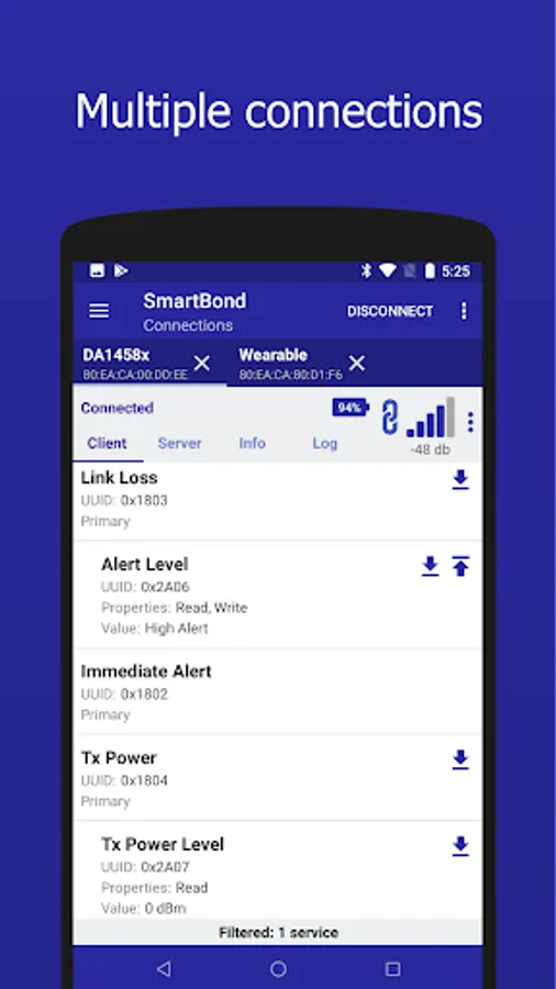 With the app you can scan for and connect to Bluetooth® Low Energy peripherals. Multiple connections and scan filtering are supported. You can also use the app in peripheral mode, so that other devices can scan for and connect to it.