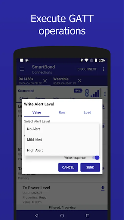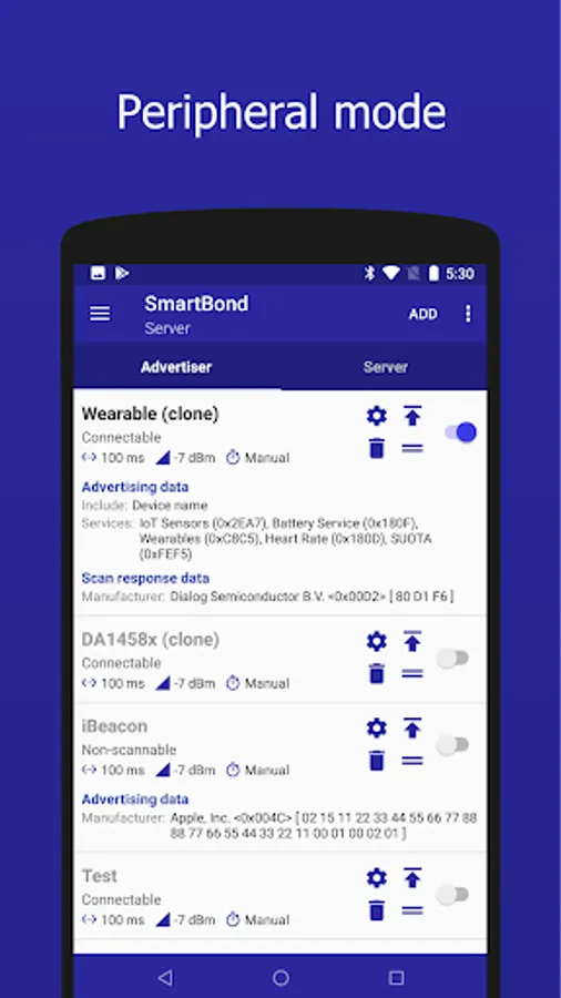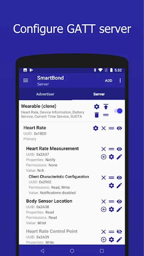 The app can act both as GATT client and GATT server. All GATT operations are supported. The app recognizes the Bluetooth® SIG adopted GATT objects, which are displayed with their proper names, their values are parsed and displayed as text, and, where supported, a custom write user interface is available. You can configure the GATT server and peripheral mode, either directly, or by cloning existing peripherals.