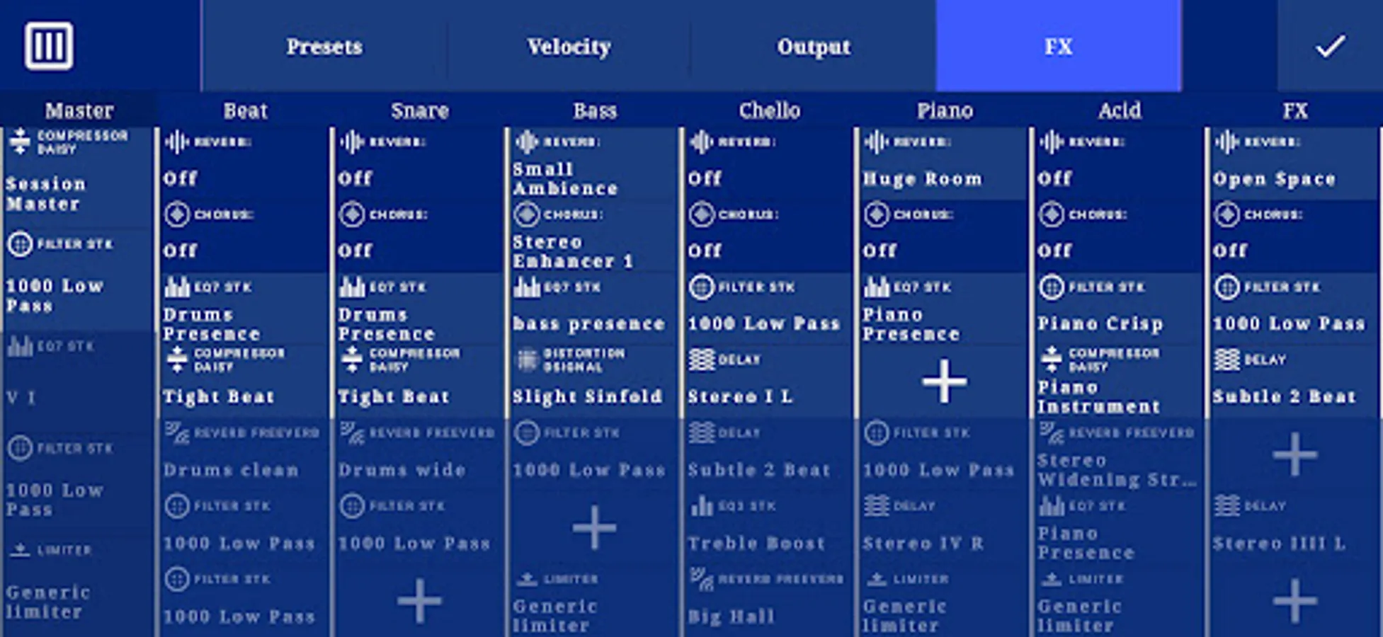 In Synth/MIDI Controller mode, you can use the app as a MIDI controller with MIDI output or explore its internal synthesizer library. The mode includes various controllers: Piano, Chord, Scale, Pad, Sequence, and Split. Each controller has its own effect rack with five slots and preset options. Whether you're a pianist, guitarist, drummer, or MIDI enthusiast, this mode provides flexible and customizable control over your musical creations.