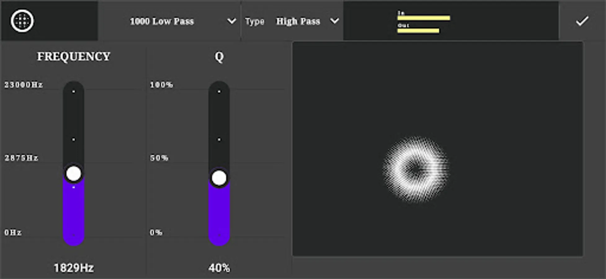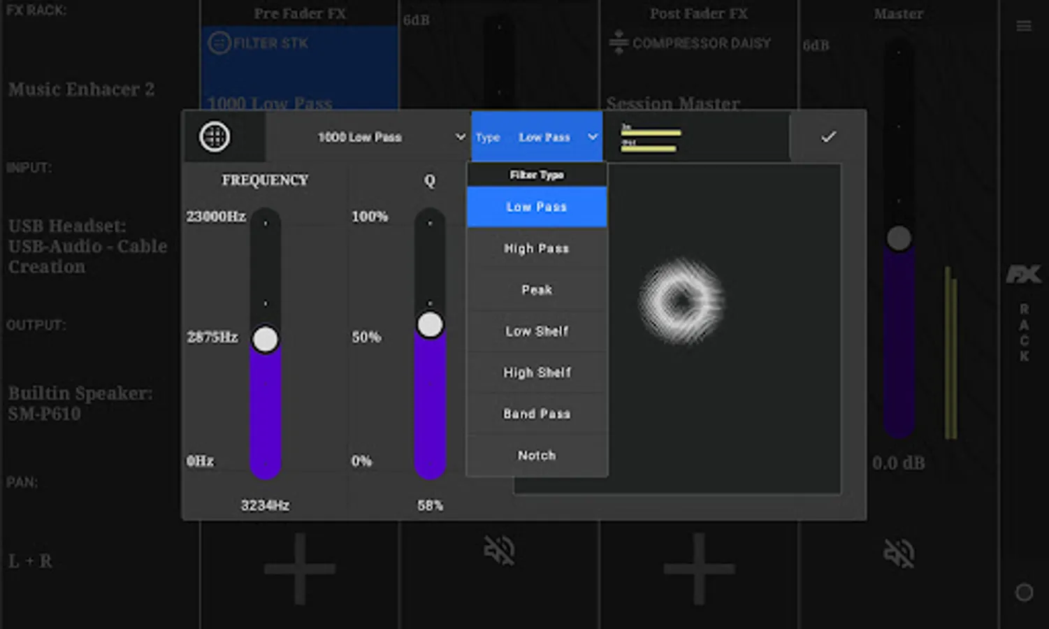 The app's filter options include Low pass, High pass, Peak, Low Shelf, High Shelf, Band pass, and Notch filters. You can control the filter settings using an XY pad for precise adjustments. The EQ3 and EQ7 equalizers enable you to fine-tune the audio with three or seven bands respectively.
