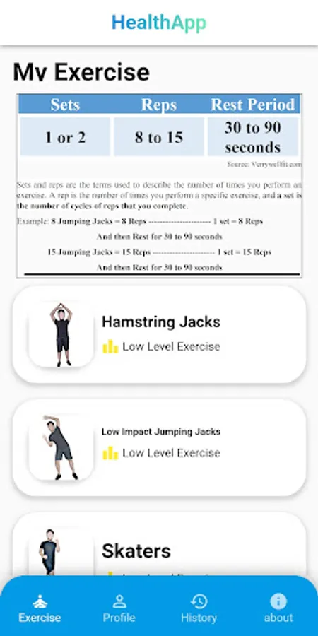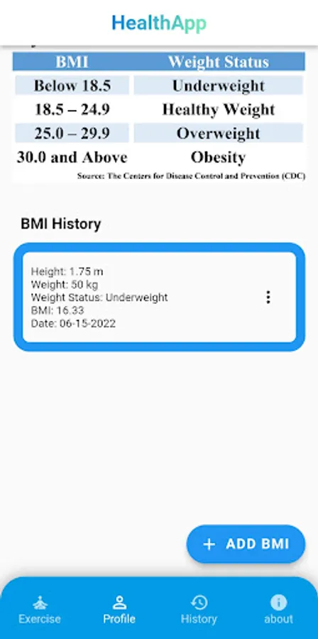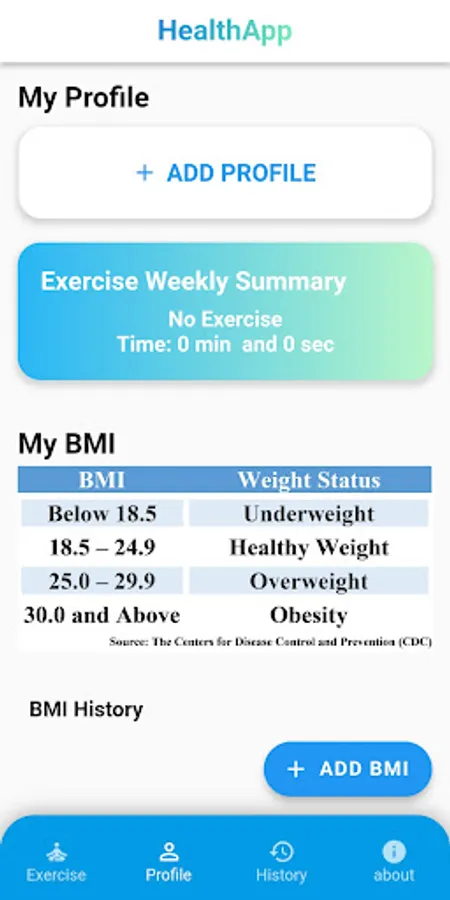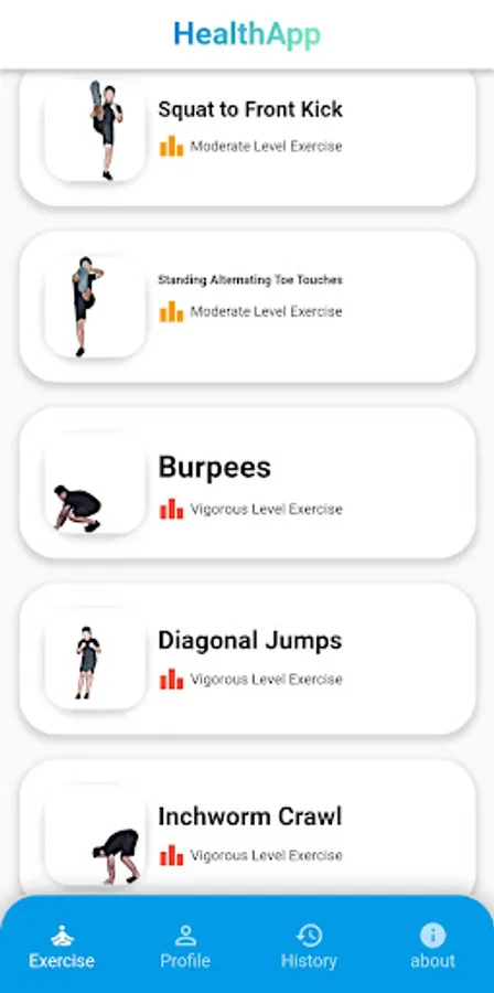 HealthApp: Android Exercise Aplication is a mobile application that provides exercise that doesnt need any equipments and facilities. HealthApp helps you record and manage your BMI and Exercises and it notifies the user if they are inactive for a week.' Please keep in mind that HealthApp is simply meant to give exercise and isnt meant to be used for disease diagnosis, mitigation or prevention. If you have any medical issues, please get medical advice before using the application. Never force your body into unpleasant postures or try any move that causes you discomfort.