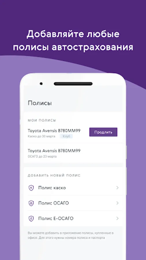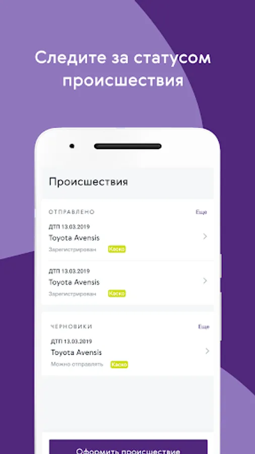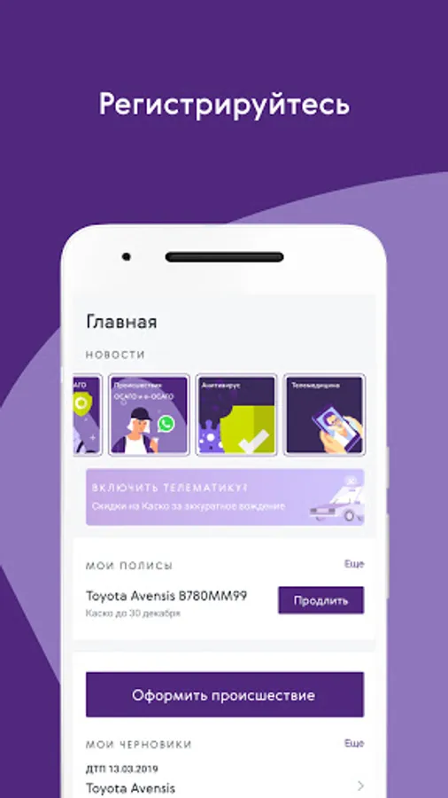 Store your policies in the app, report incidents, get full insurance support. Get information about new services and offers of the company.