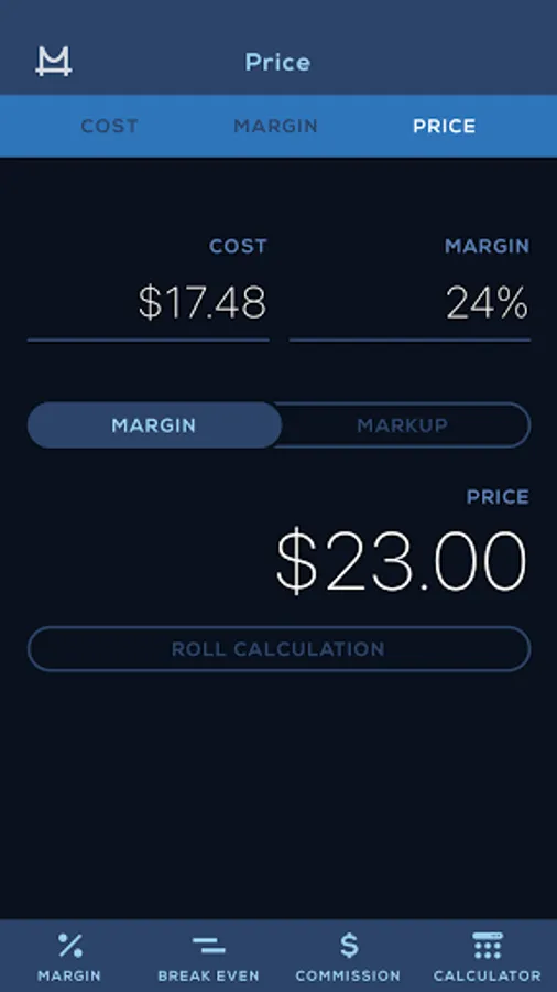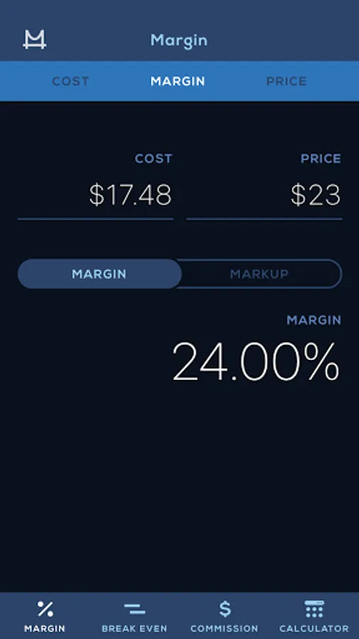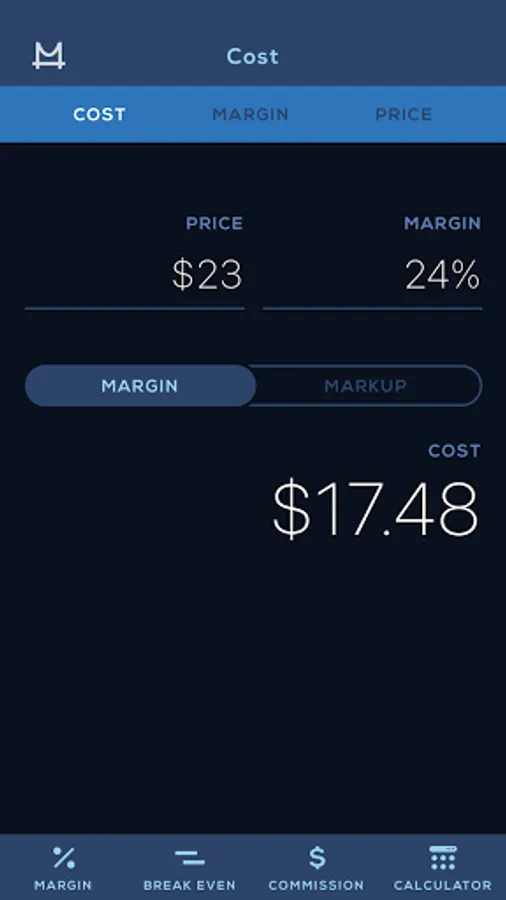 This easy-to-use business tool puts you 100% in charge by accurately calculating cost, margin/markup, price, and commission. Simply input two known variables to get to your answer quickly.