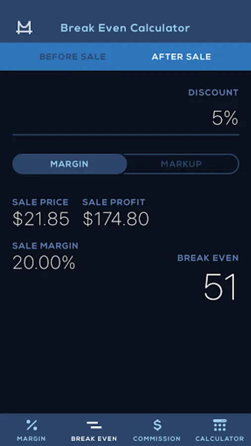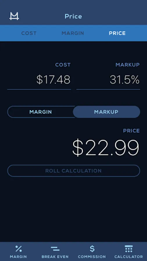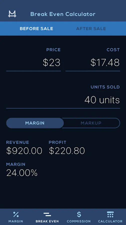 • 6 Functional Calculators (Cost, Margin/Markup, Price, Commission, Break-Even, Standard Calculator)