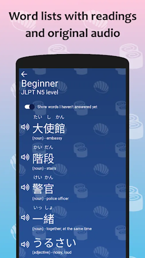 - Vocabulary categorized from beginner (JLPT N5) up to advanced (JLPT N1)