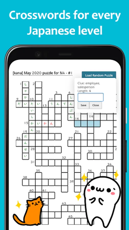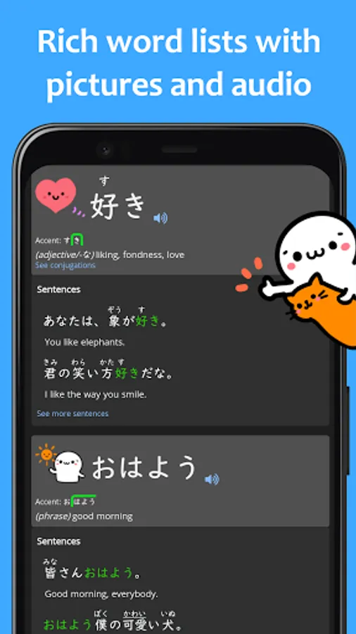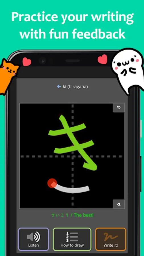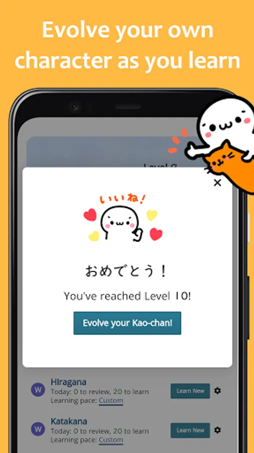 Our mascot Kao-chan is here to let you enjoy learning Japanese, whether it’s through collectible coins every time you quiz, a character that evolves as you learn, manga pages that you unlock, or hundreds of hand-made illustrations.