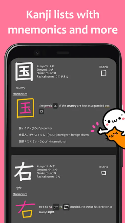 ■ Kanji: 12,000+ kanji, with no limits on what you can study! Over 2,000 colorful mnemonics help you to understand and retain the meanings.