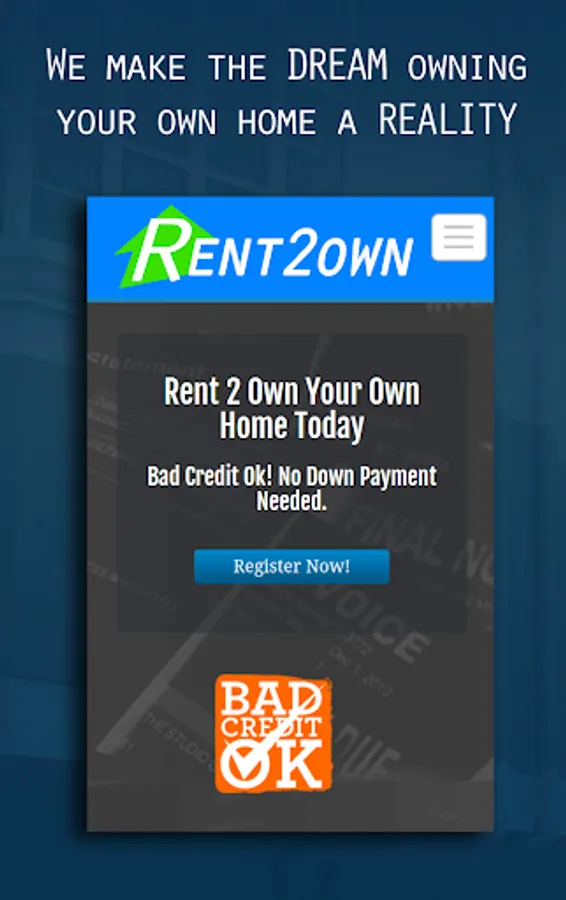Download this app if you want to own your own home but have been unable to due to an unlucky credit situation. Our app will give you the best chance of quickly finding a new home. In some cases it can even result in you paying LESS than what you are currently paying in rent to your landlord.