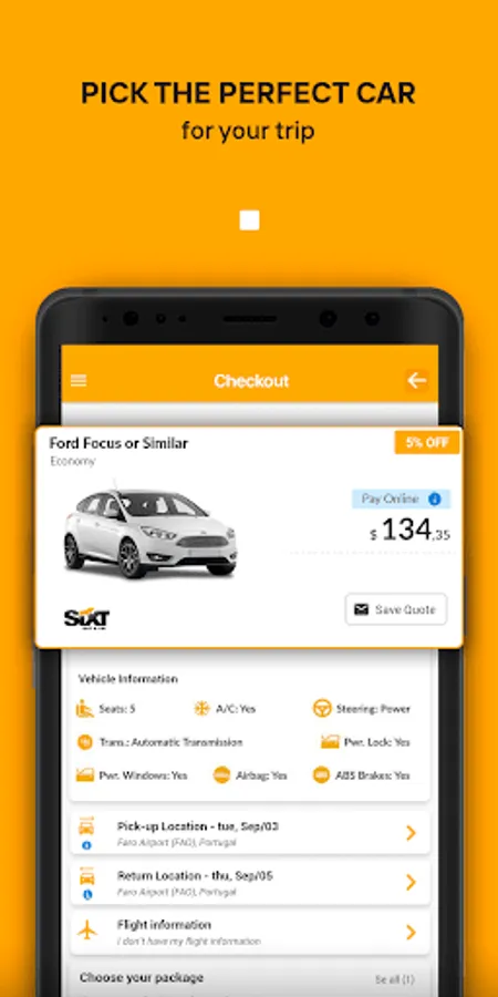 In moments, the app shows you which rental companies have the cheapest cars at your destination. Then, you can filter by features such as automatic transmission, 2 or 4 doors, etc., select how many passengers you intend to transport, choose the vehicle category, the rental company, insurance, and payment method!