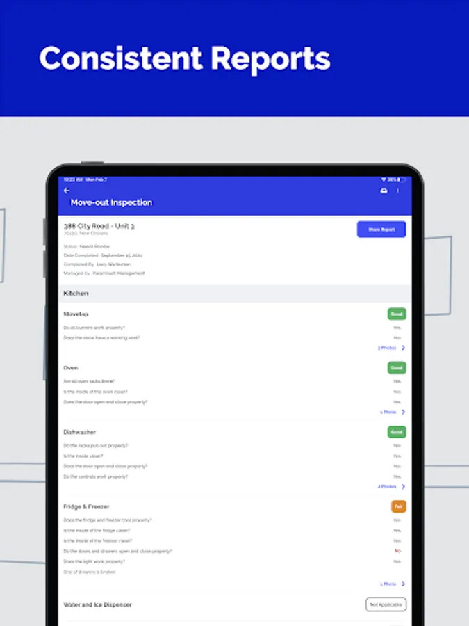Take photos, check appliances, evaluate each room’s condition, and add notes to create an unalterable and time-stamped record of the property's condition all from your mobile device.