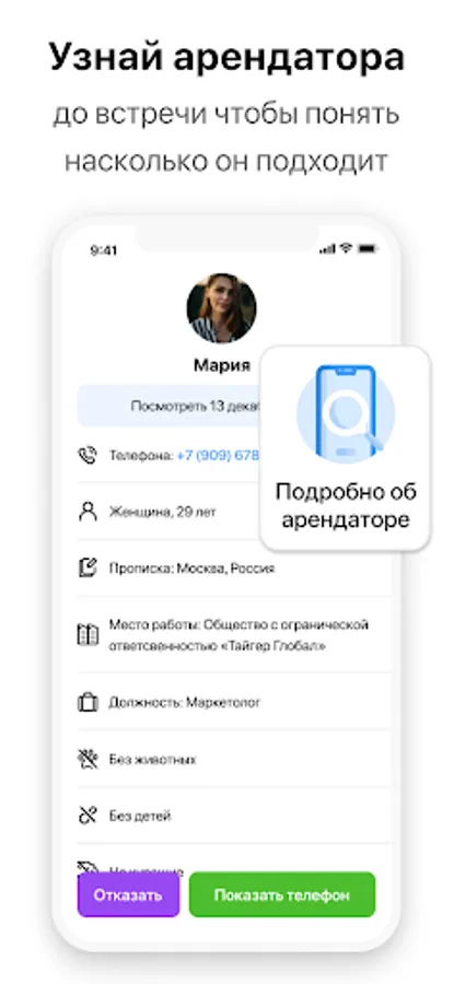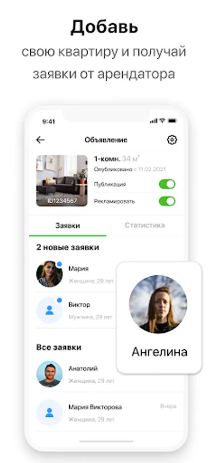 Тестируйте спрос на недвижимость, при необходимости ведите учёт коммунальных платежей и платежей за аренду прямо в приложении. Возможность глубоко познакомиться с арендатором до первого контакта позволяет выбрать лучший вариант для безопасной сдачи вашей квартиры