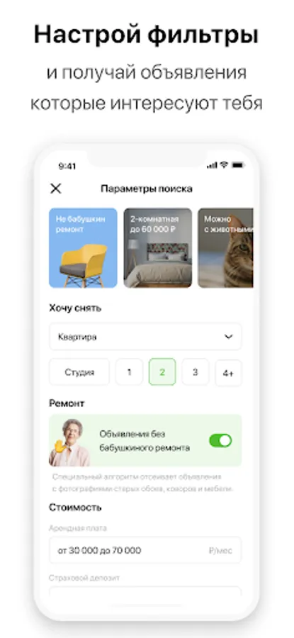 - Фильтры позволяют игнорировать плохой ремонт и посредников с комиссией