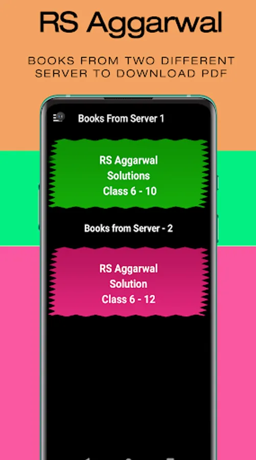 • In this app RS Aggarwal Solution Devided in two section Books from Server 1 which contain RS Aggarwal Solution from Class 6th to 12th.