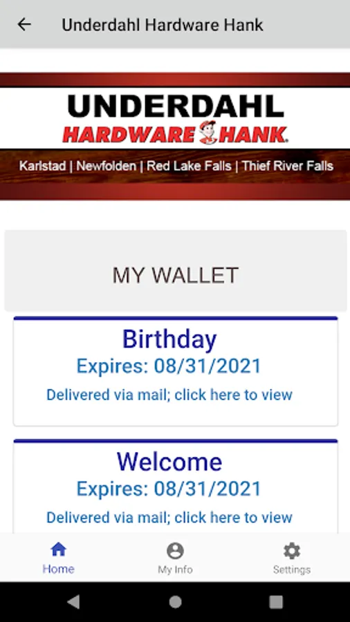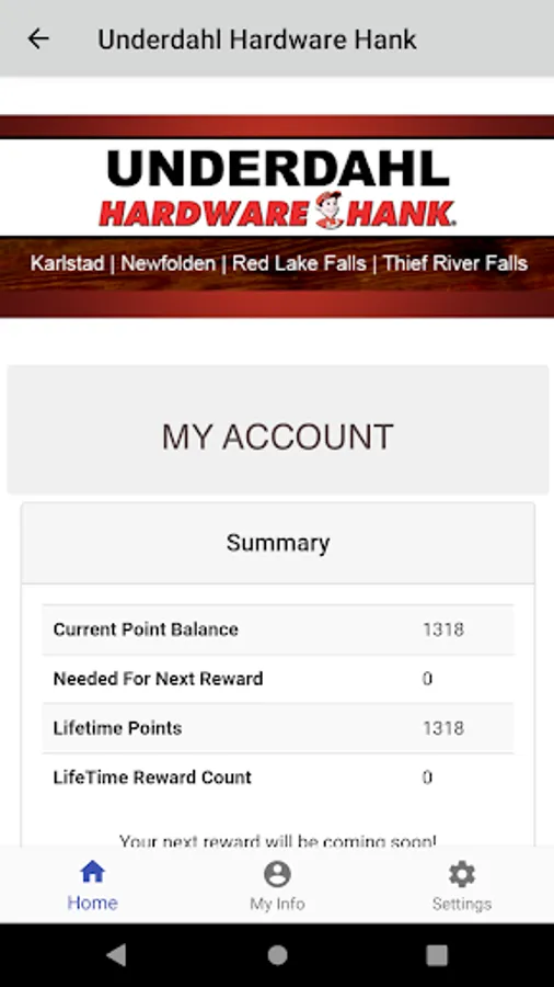 The Underdahl Hardware mobile app delivers offers and loyalty information to on-the-go customers, giving quick access to exclusive deals, enrollment options, loyalty point balance and rewards lookup, loyalty program information, and information about our business.
