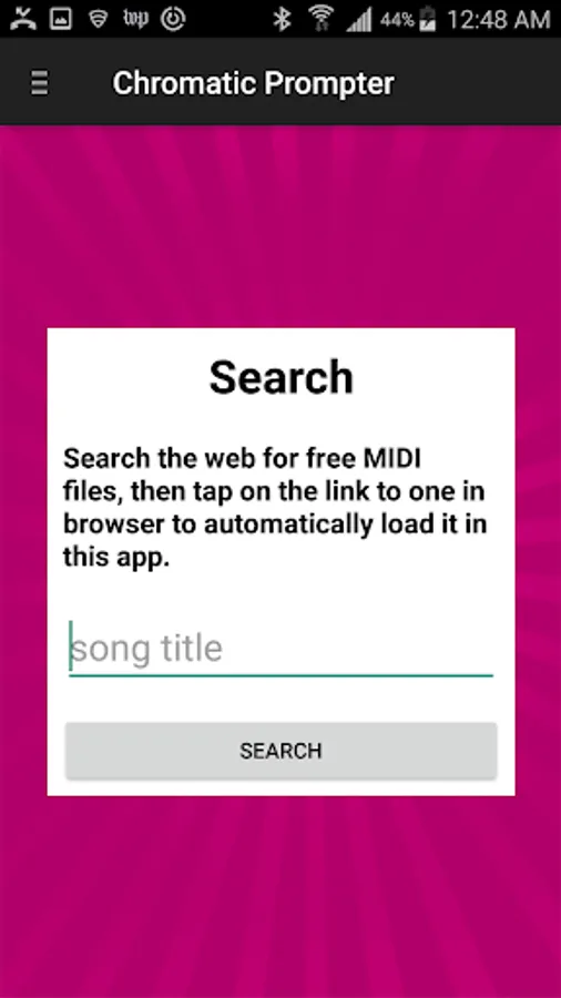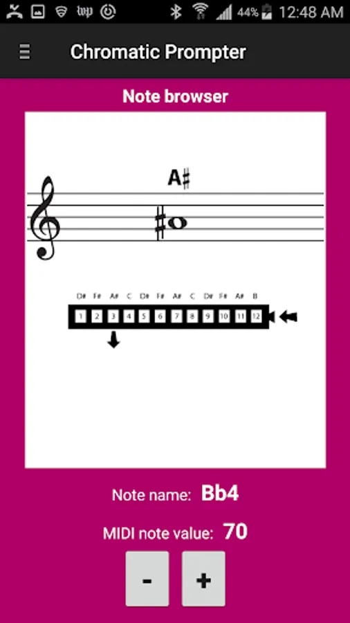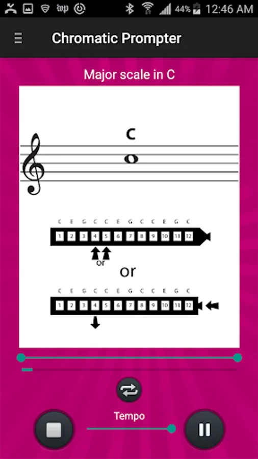 The easiest, most fun way to learn to play the 12-hole C chromatic harmonica! It's like a teleprompter for the chromatic harmonica: blow or draw on the hole shown on the screen and operate the slide button as shown to play along with the included scales--or import a song MIDI file from your e-mail or from a web site and see the correct note diagram in real time as the song plays! Slow down any song to make it easier to play along with, and adjust the playback speed at any time!