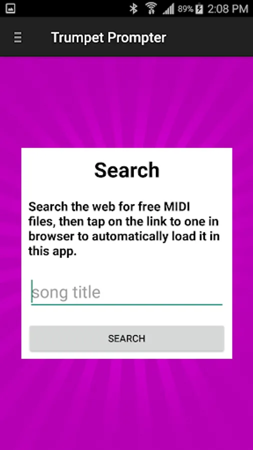 The easiest, most fun way to learn to play the trumpet (or cornet)! It's like a teleprompter for the trumpet: play the note fingerings shown on the screen to play along with the included scales--or import a song MIDI file from your e-mail or from a web site and see note fingerings for the trumpet in real time as the song plays! Slow down any song to make it easier to play along with, and adjust the playback speed at any time!