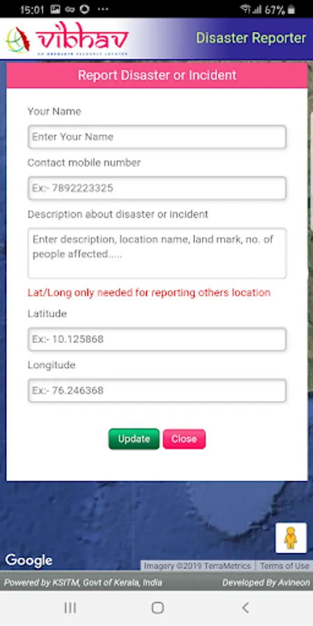 This is an initiative from Kerala State IT Mission (KSITM), KSITM is a government organization under Department of Information Technology, Kerala. Its headquarters is at Thiruvananthapuram. This app helps citizen to report disaster management team(located using Vibhav - Disaster Locator app) in a natural disaster like flood.