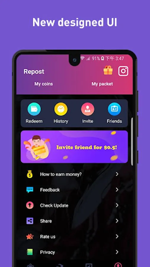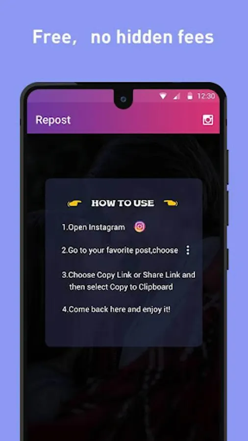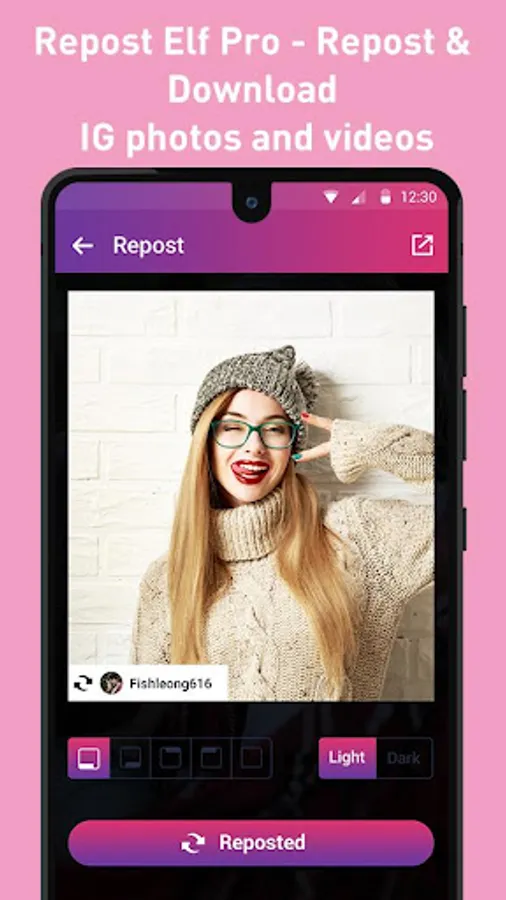 Repost Elf Pro helps you repost and download your loved IG posts freely. Also, you can discover new updated videostatus and picturestatus in it, you will increase your followers in social platforms and enjoy more happiness with friends if sharing.