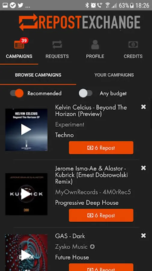 2. Use credits to request reposts of your tracks from other like-minded artists. Start with 30 credits for free