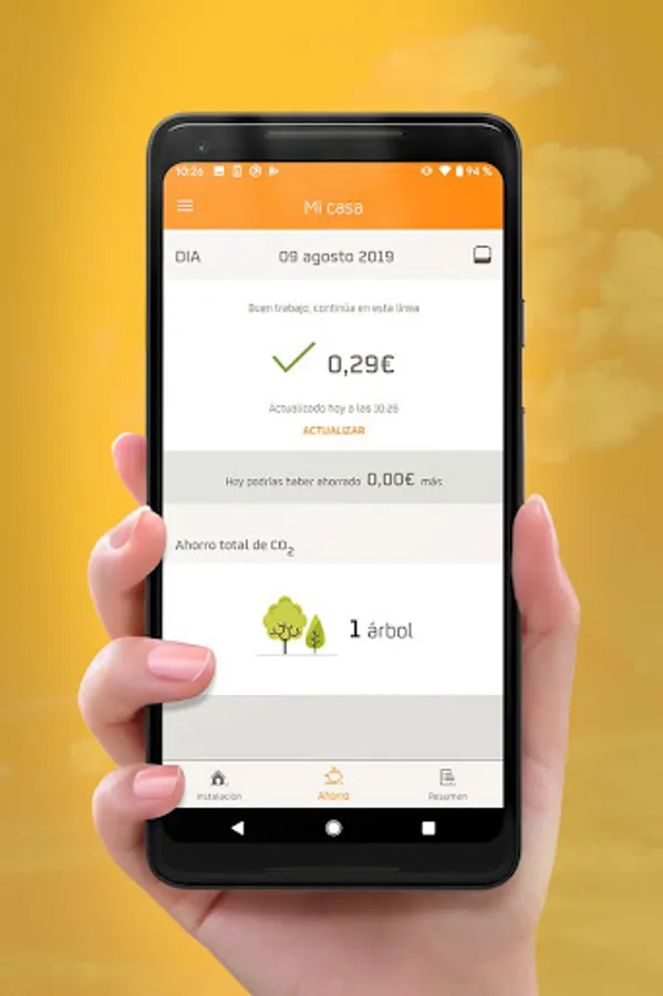 Repsol Solify customers participate in the reduction of the “carbon footprint” thanks to the self-consumption of renewable energies such as photovoltaic energy. The application has a CO2 emission calculator that calculates the equivalent savings in km traveled by car, liters of gasoline and number of trees needed to absorb said CO2.