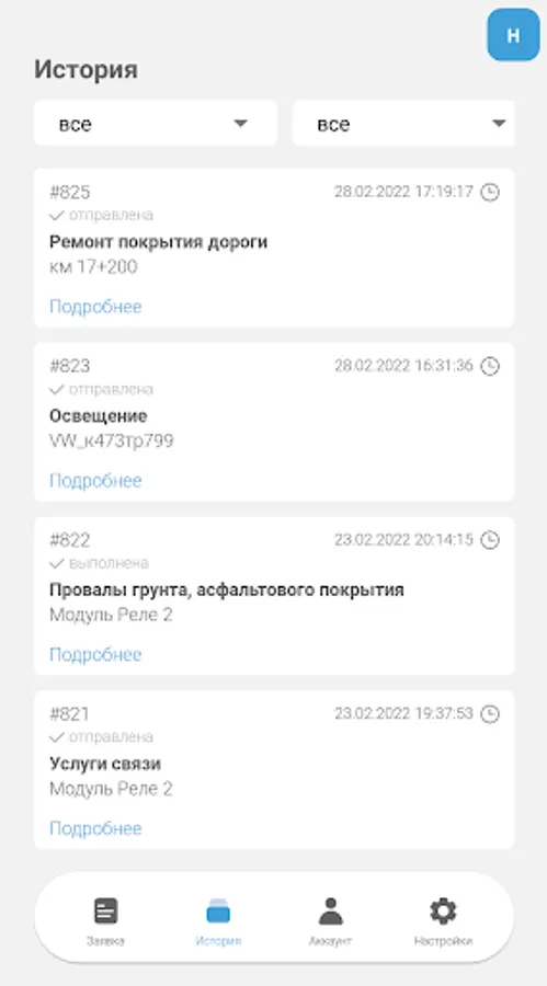 Cases created by the user, as well as their status, can be viewed in the "history" section.